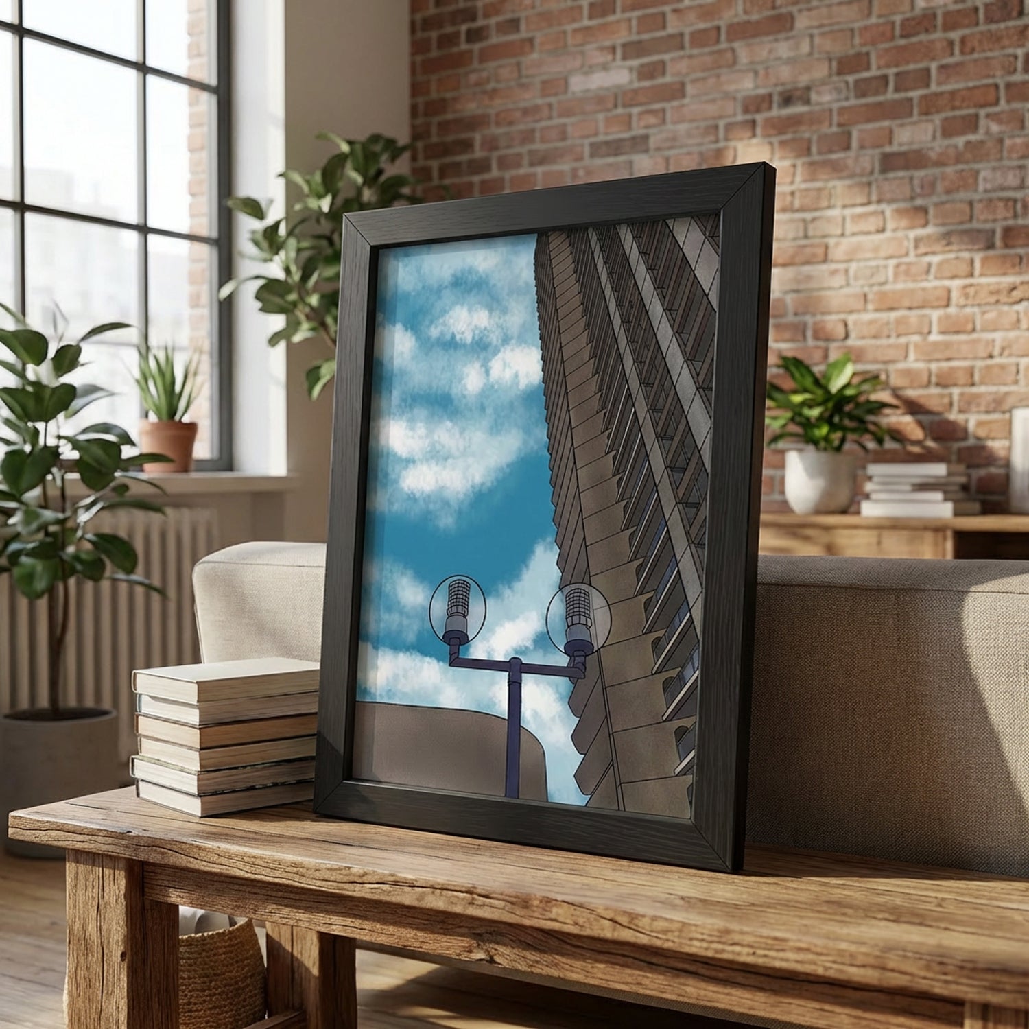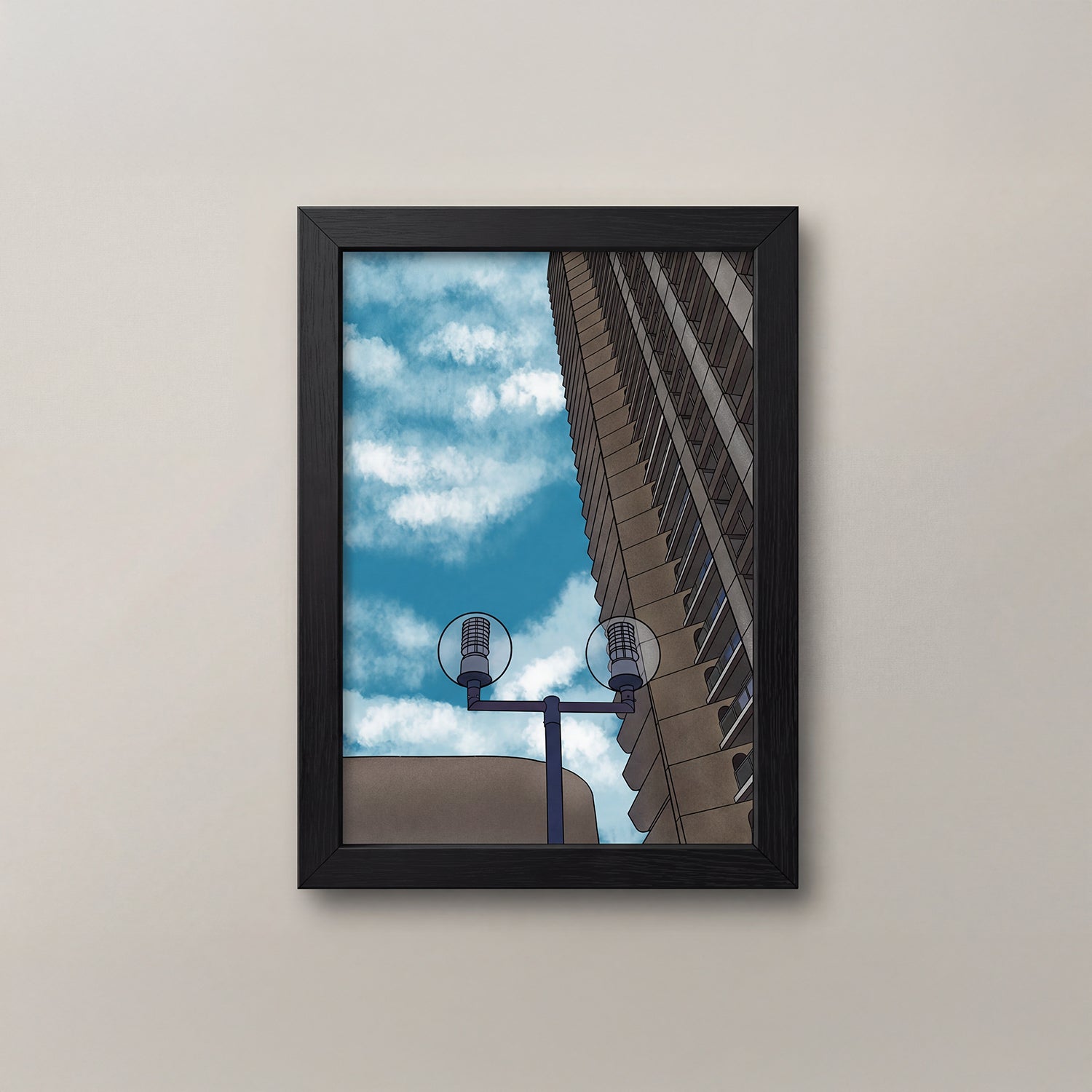 This particular piece is an illustration of the Barbican Estate, one of London’s most celebrated examples of Brutalist architecture. Designed in the mid-20th century, the estate is renowned for its raw concrete textures, striking geometric forms, and thoughtfully designed living spaces that integrate greenery with urban density. Its elevated walkways, podium-level gardens, and sculptural aesthetics have made it a landmark of post-war modernism.